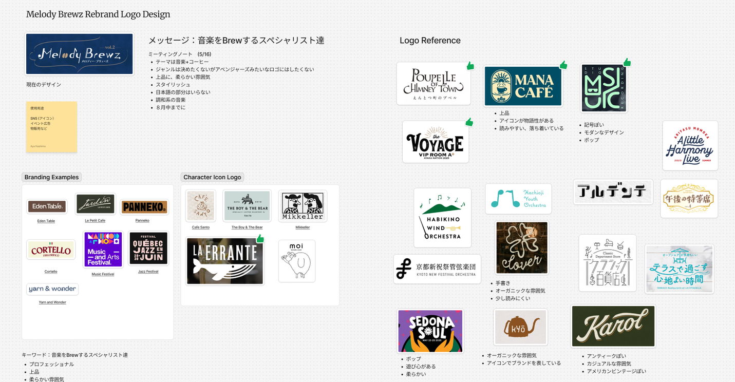 My client wanted to update the logo to reflect a luxury experience that combines coffee and music. After understanding the client's vision for the brand, we created a set of keywords and reference boards to ensure we're aligned.