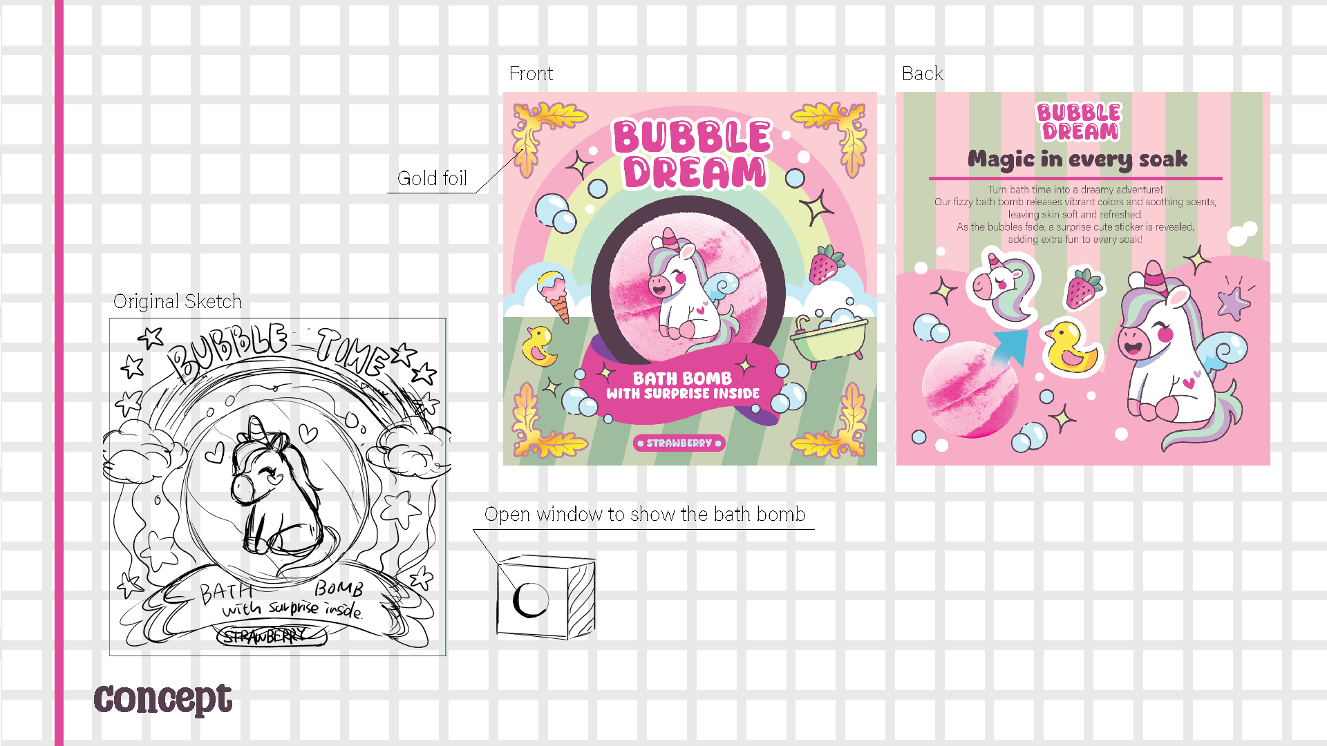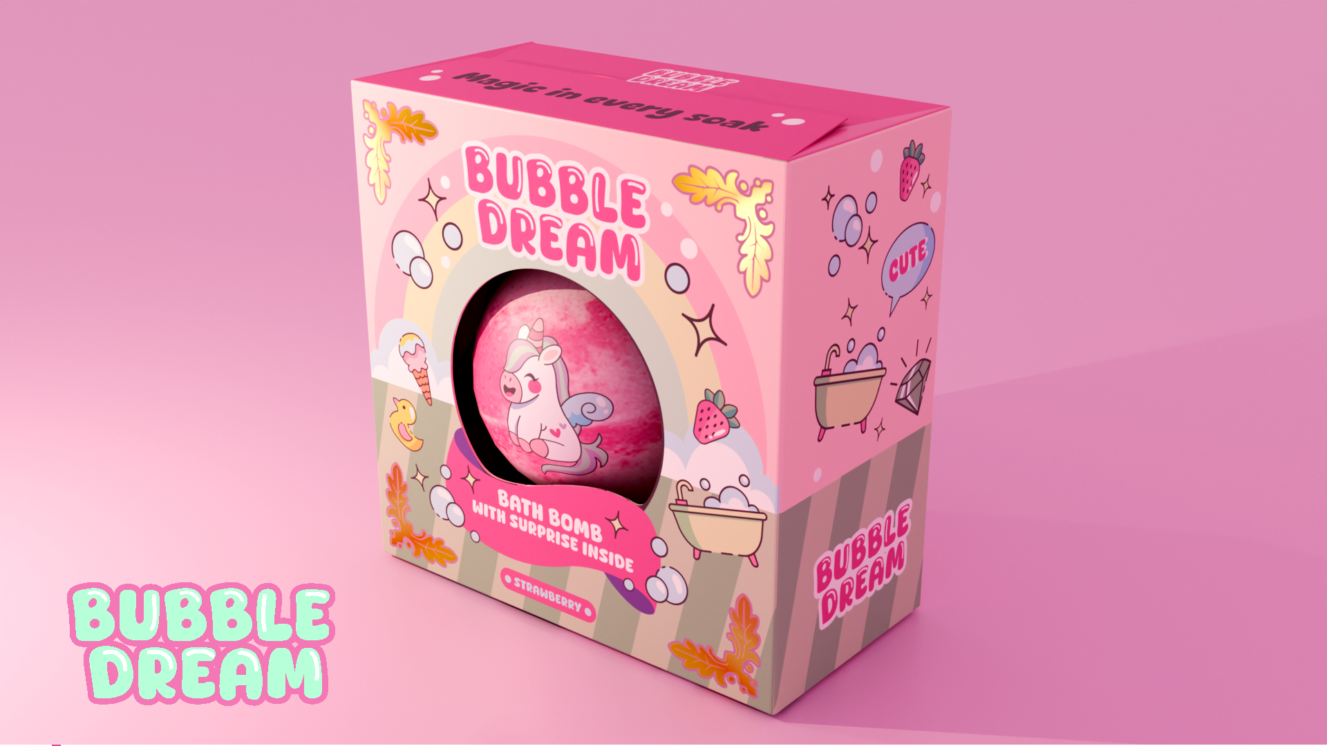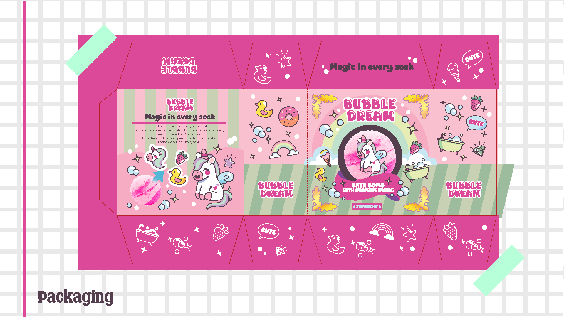 Bubble Dream is a self-initiated package design project created to reimagine bath products for a younger, kawaii-inspired audience. The goal was to design a bath bomb brand that feels playful, inviting, and magical—encouraging girls who love cute aesthetics to see bath time as a fun and relaxing ritual. The concept combines pastel colors, dreamy motifs, and charming character illustrations to make the product feel like a treat both visually and experientially.